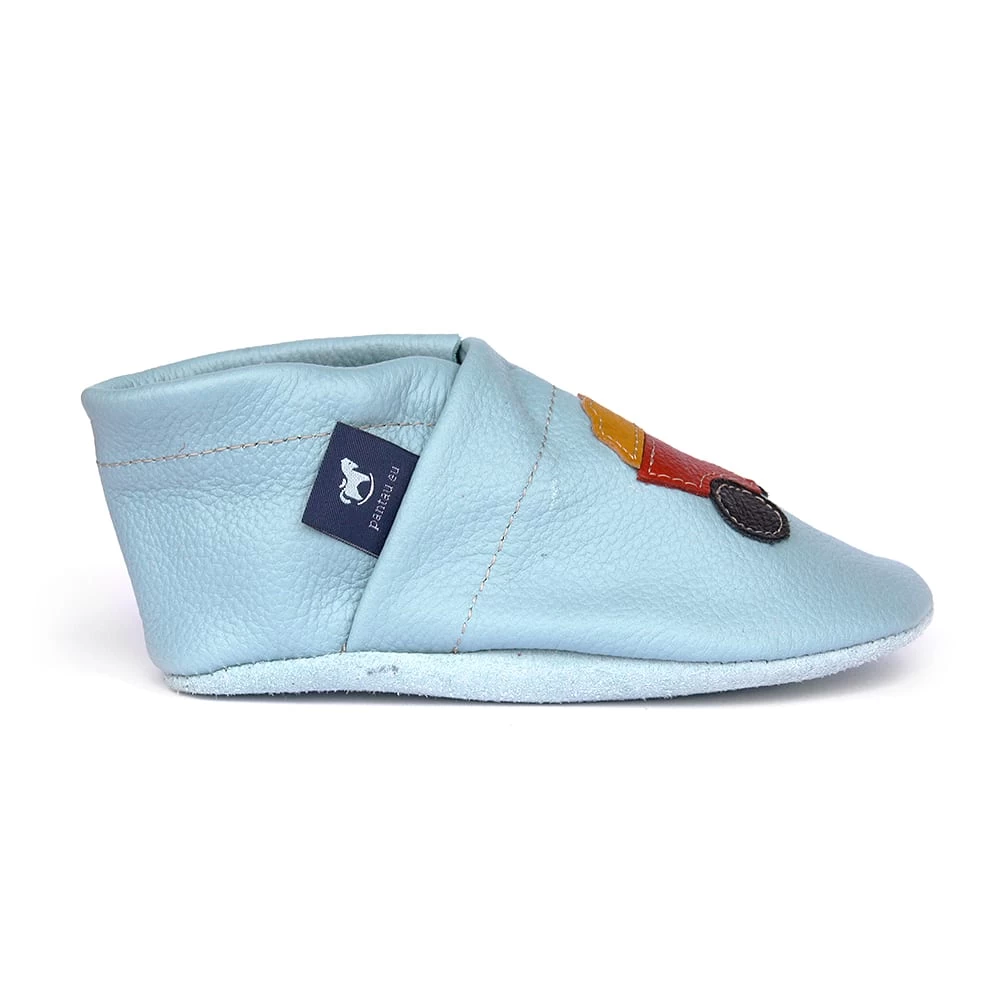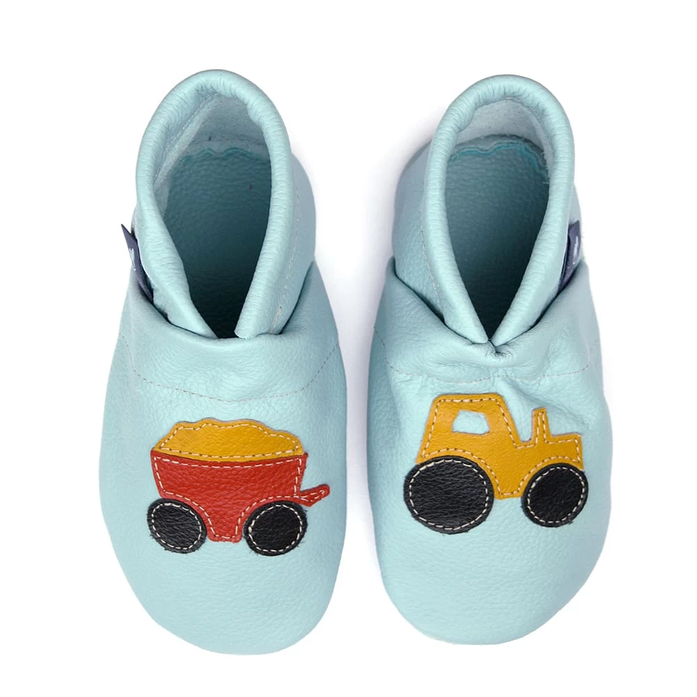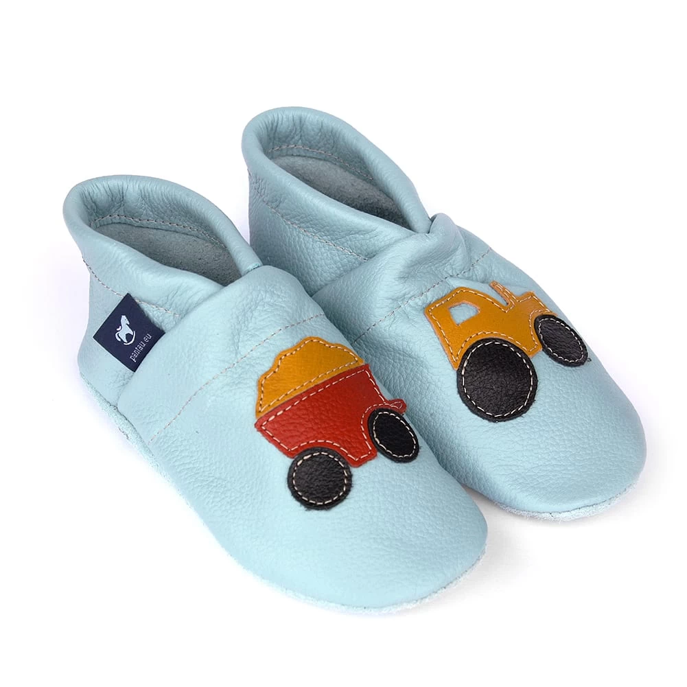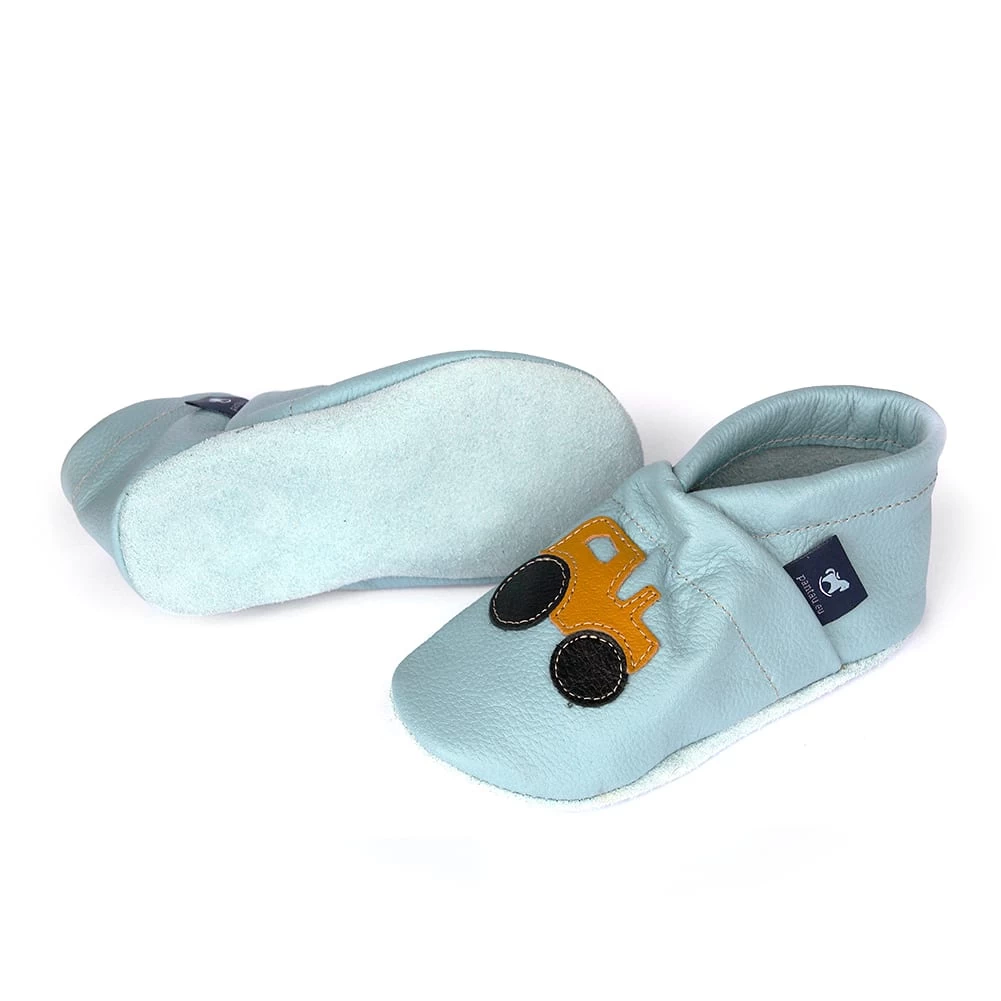 Hausschuhe / Lederpuschen Mit Traktor In Hellblau / Gelb