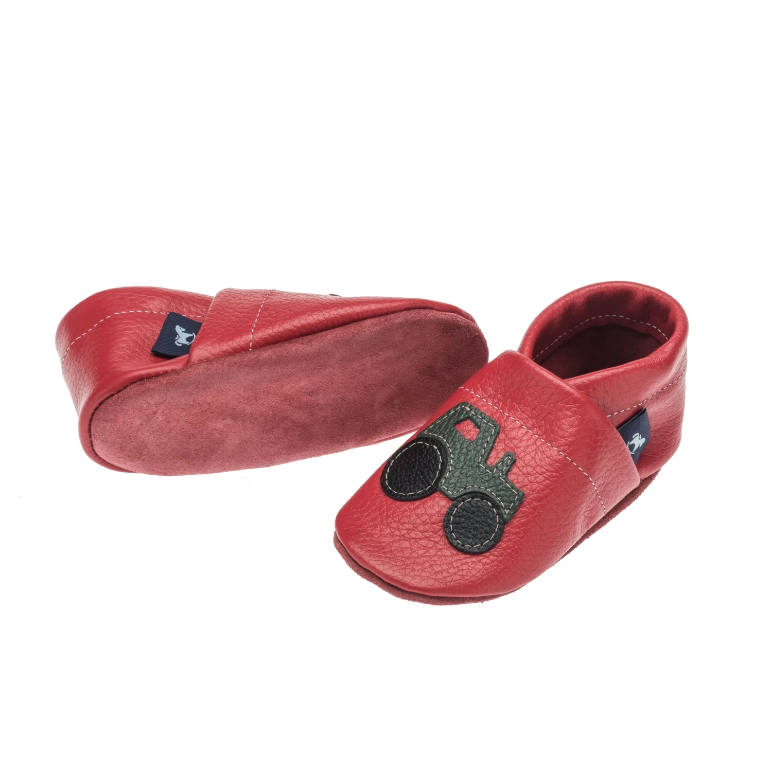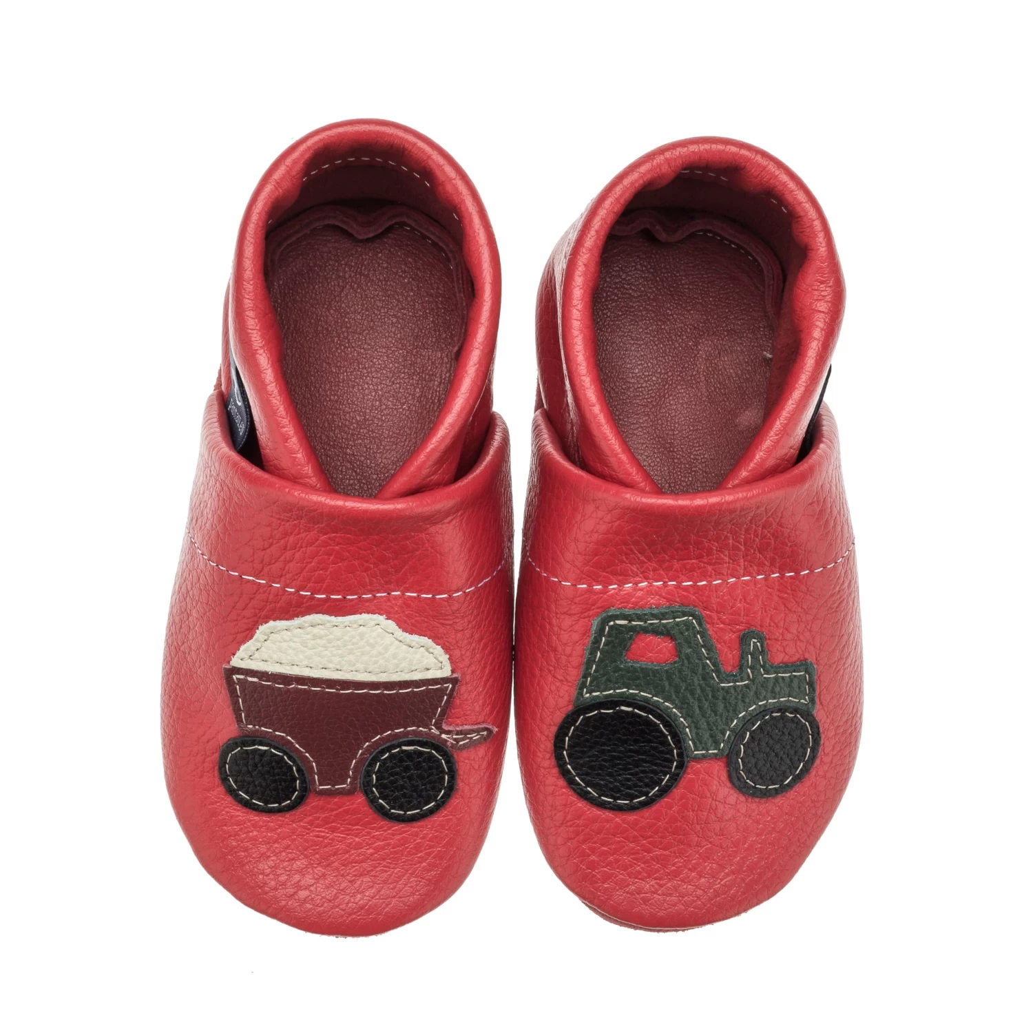 Hausschuhe / Lederpuschen Mit Traktor In Rot / Grün