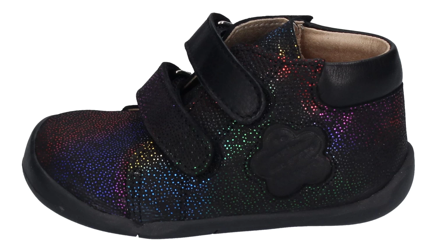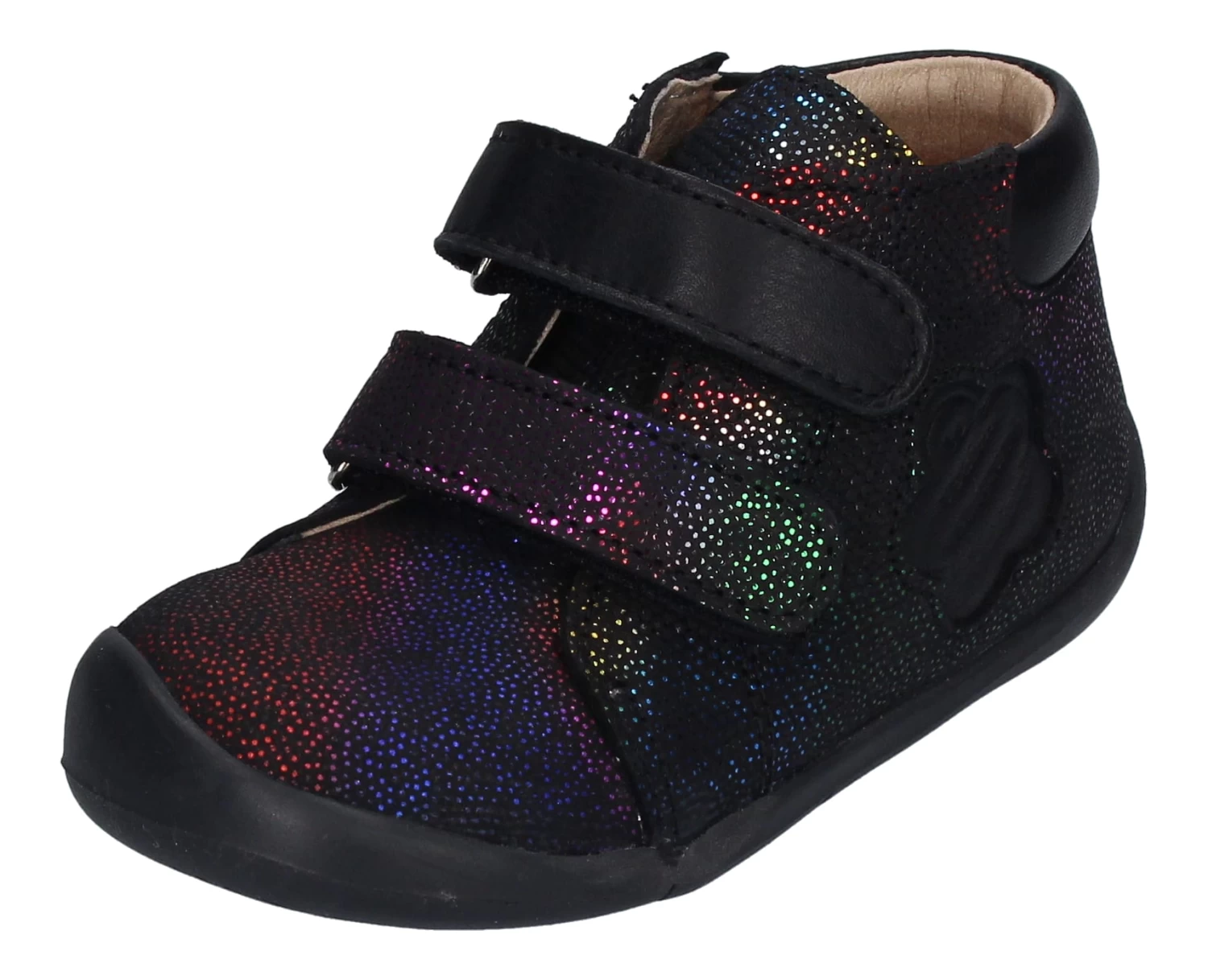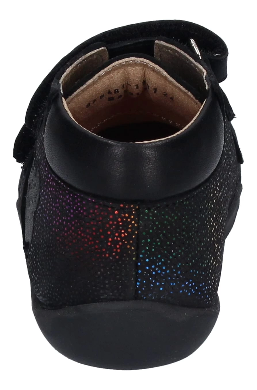 Kickers ist seit sehr langer Zeit bekannt für gute Kinder- und Lauflernschuhe. Diese niedlichen Lauflernschuhe Wakalla in schwarz mit Glitzerpunktchen sind mit der Kickersblume verziert. Sie sind aus weichem Leder gefertigt und durch die beiden Klettverschlüsse ist das An- und Ausziehen überhaupt kein Problem