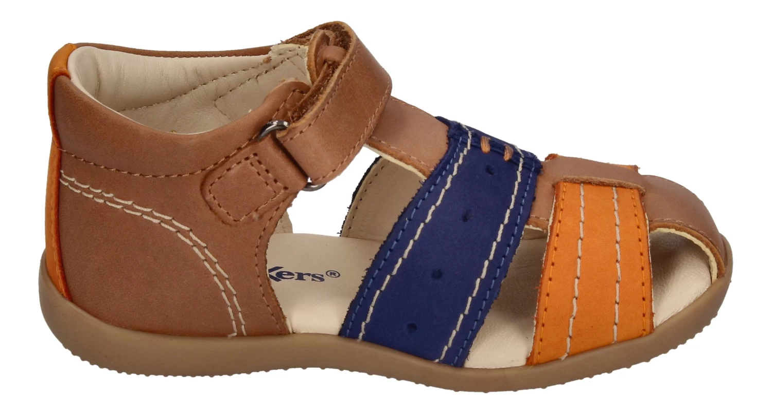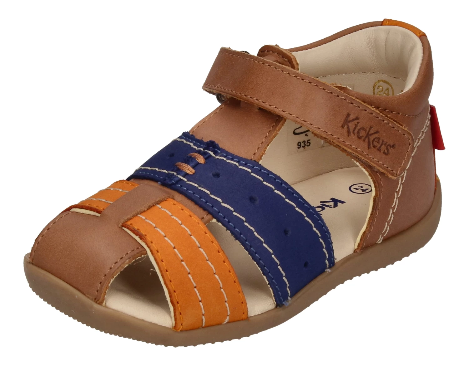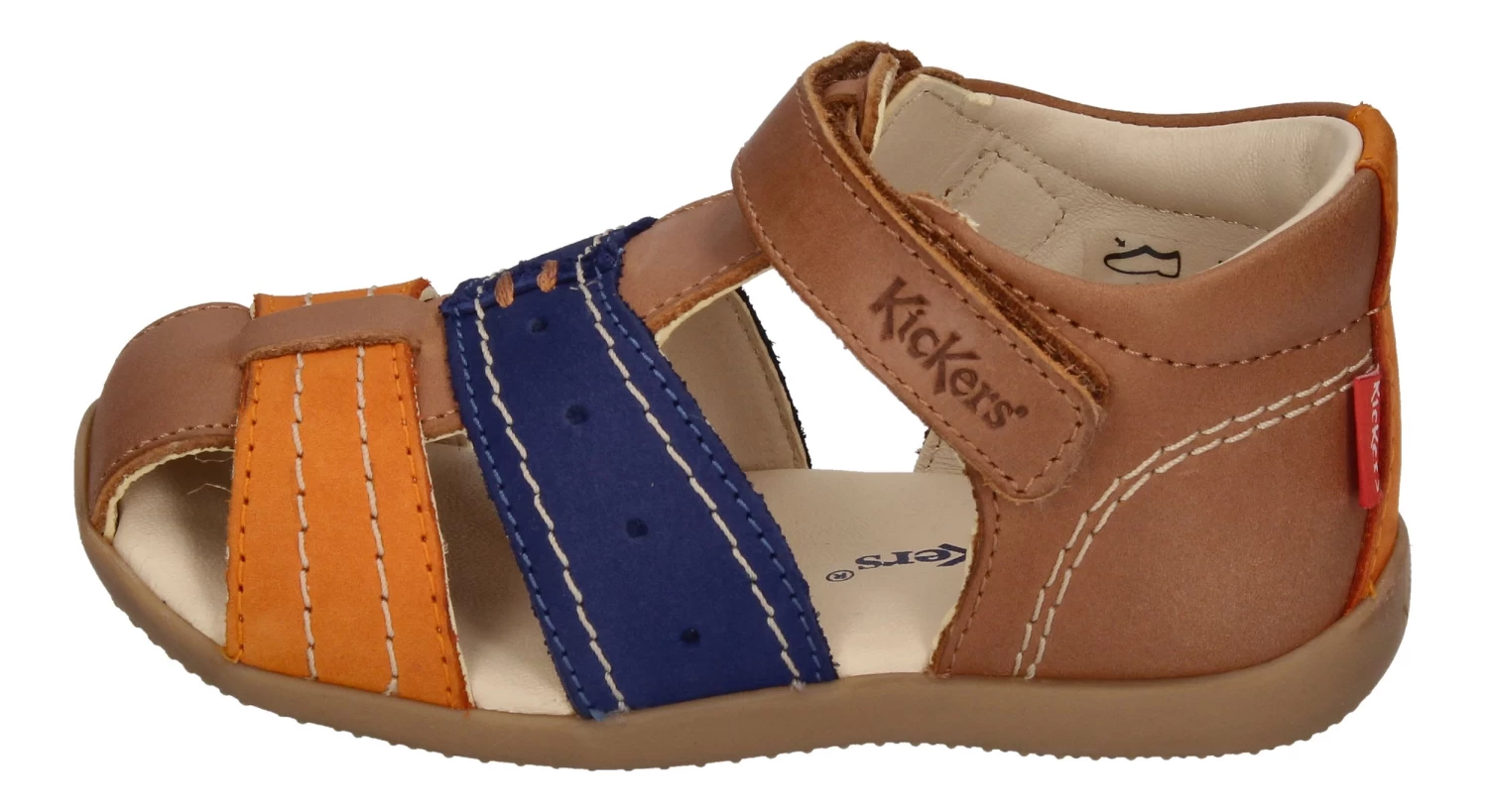 Kickers ist seit sehr langer Zeit bekannt für gute Kinder- und Babyschuhe. Diese niedlichen Sandalen Bigbazar 2 in hellbraun, orange und blau sind innen wie auch außen aus weichem Leder gefertigt. Durch den Klettverschluß ist das An- und Ausziehen überhaupt kein Problem. Zum Schutz der kleinen Zehen ist die Sandale vorn mit einem Riemchen versehen.