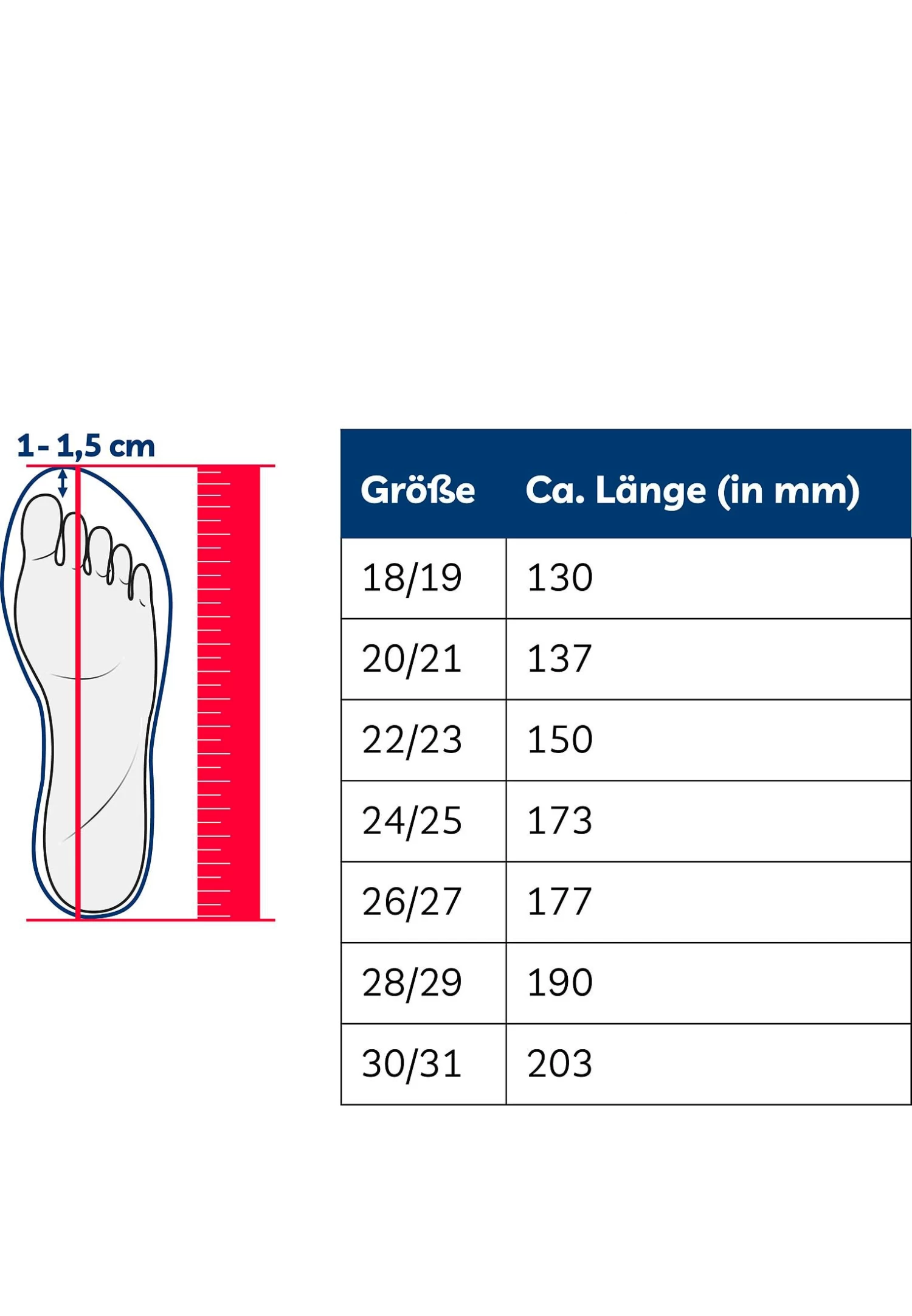 Egal ob am Strand oder im Schwimmbad, mit diesen praktischen Aqua-Schuhen ist ihr Kind bestens für die Badesaison gerüstet. Die Badeschuhe aus schnelltrocknendem Material haben eine rutschhemmende TPR Sohle und schützen die Füße vor spitzen Steinen und heißem Sand. Die Wasserschuhe passen sich durch ihre flexible Passform perfekt an die Füße Ihres Kindes an und geben so ein Gefühl des Barfußlaufens. Eine Einstiegshilfe für noch leichteres An- und Ausziehen. Einfach Hineinschlüpfen und schon sind die Kinder startklar. Mit der rutschhemmenden Gummisohle mit Noppen läuft ihr Kind sicher auch auf rutschigen oder nassen Böden – Obermaterial: Textil – Futter & Decksohle: Textil – Laufsohle: Sonstiges Material