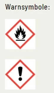 Gefahr: Flüssigkeit und Dampf leicht entzündbar. Verursacht schwere Augenreizung. Schädlich für Wasserorganismen, mit langfristiger Wirkung. Von Hitze, heißen Oberflächen, Funken, offenen Flammen und anderen Zündquellen fernhalten. Nicht rauchen. BEI KONTAKT MIT DEN AUGEN: Einige Minuten lang behutsam mit Wasser spülen. Eventuell vorhandene Kontaktlinsen nach Möglichkeit entfernen. Weiter spülen. Bei anhaltender Augenreizung: Ärztlichen Rat einholen/ärztliche Hilfe hinzuziehen. Ist ärztlicher Rat erforderlich, Verpackung oder Kennzeichnungsetikett bereithalten. Freisetzung in die Umwelt vermeiden. Entsorgung des Inhalts/Behälters gemäß den örtlichen Vorschriften.